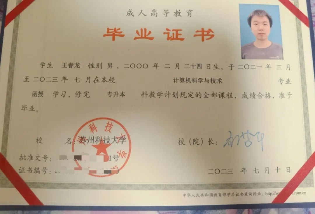 为提升学历,他报名参加了成人自考,成功被苏州科技大学录取,通过三年的本科阶段学习,顺利获得毕业证书,实现了就业、升学双丰收。